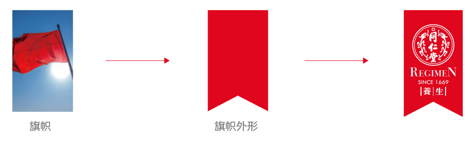 旗幟的造型比直接用方形更有意義,旗幟代表著榜樣和標桿,正是因為如此,我們希望以旗幟的形式賦予同仁堂品牌新的理念,樹立同仁堂中國醫藥行業標桿;同時旗幟也像絲帶一樣,有祝福、吉祥之意,象征了同仁堂養生對人類健康的美好祝愿,寓意國之瑰寶,同仁堂在傳承和創新中繼續造福人類。而且旗幟的圖形更加容易與后期的營銷物料進行內容布局結合。