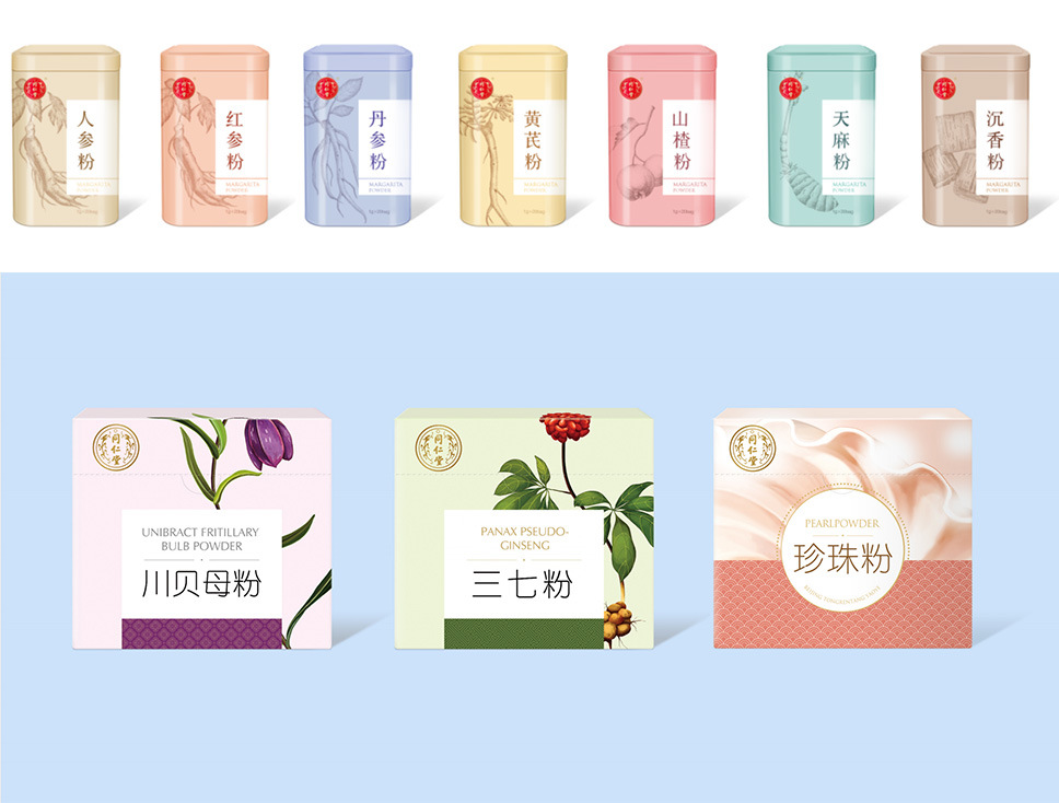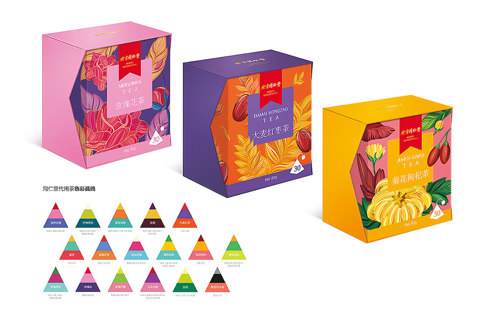 在戰略色彩定位上,運用了跨界融合與對撞的手法,以及經典中式風格的色系傳遞出同仁堂藥材的高品質以及同仁堂傳承文化的質量觀、整體以飽和度適中的色調傳遞出輕松、健康、自然。