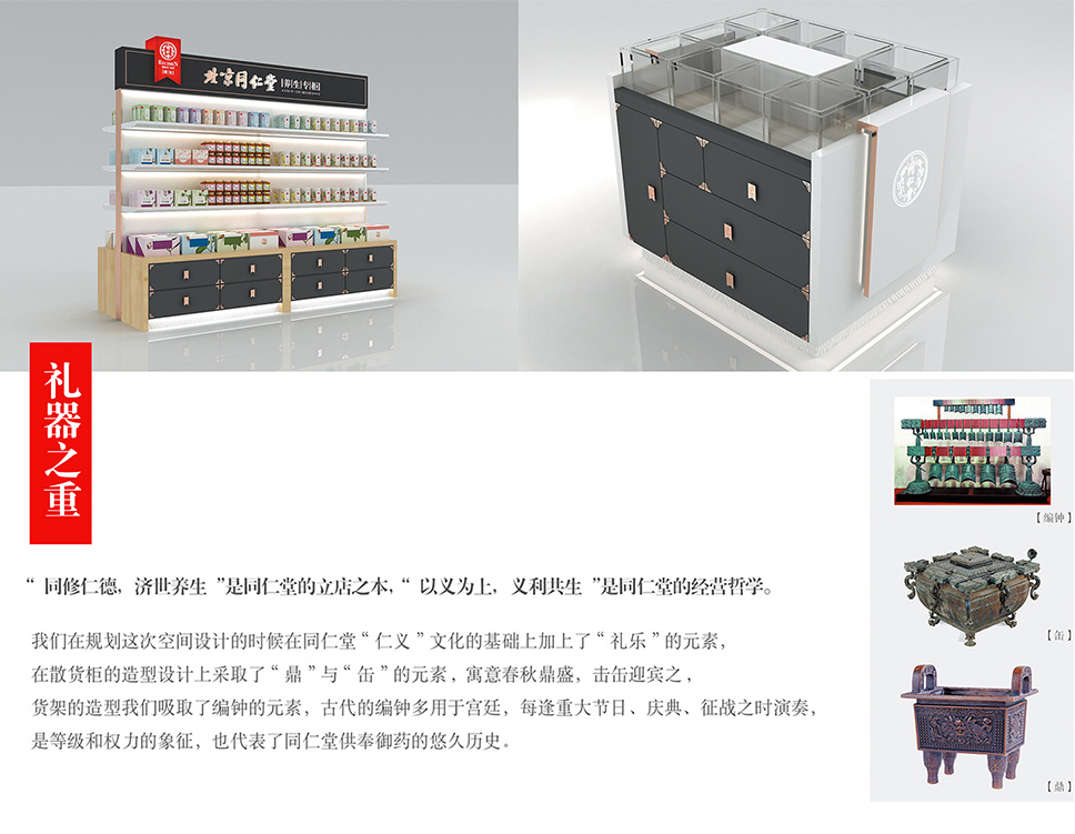 我們在這次專柜設計的時候在同仁堂“仁義”文化的基礎上加上了“禮樂”的元素。 “ 擊缶迎賓”表現“ 禮器之重”。