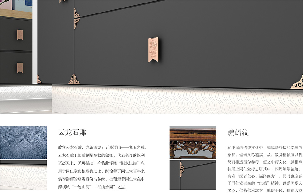 “海水江崖”浮雕應用于同仁堂藥柜踢腳之上,此紋來源于故宮云龍石雕,云龍其上的雕刻是皇權的象征。