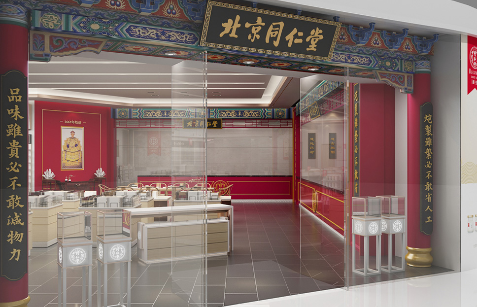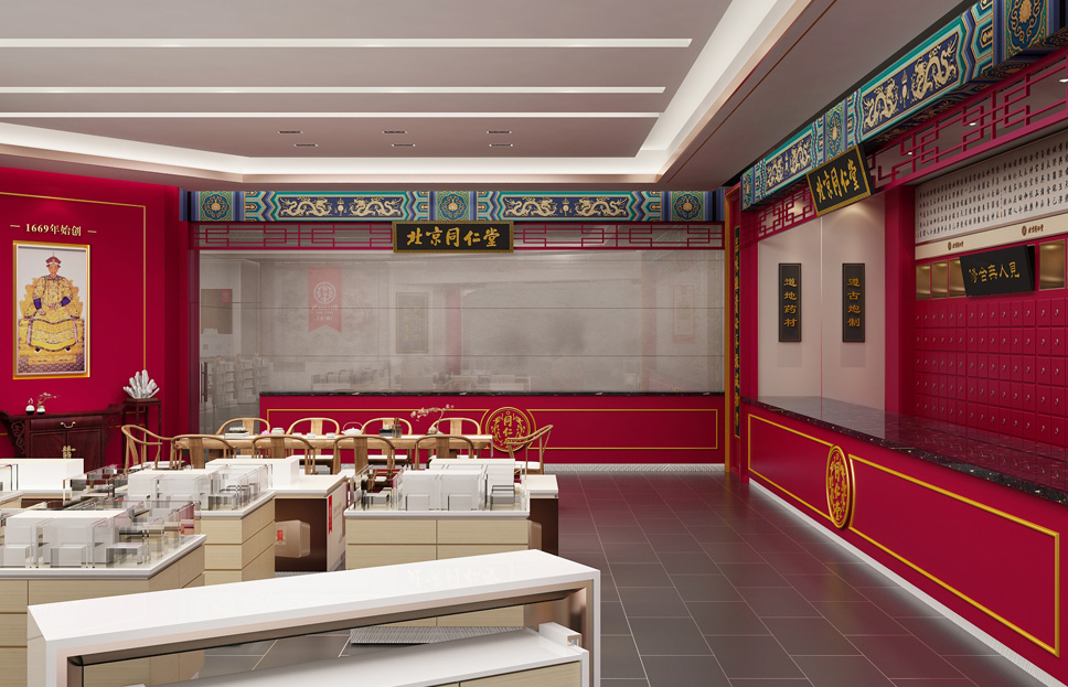 以中國傳統的對稱平衡為基本原則,以戶為門,以牖為窗,在保留了同仁堂經典元素的同時進行店面優化升級。